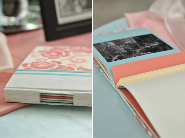 For this guestbook I tried my new bookbinding stitch called the longstitch, which ties around the head and tail of the book, but I actually used a stitch called a buttonhole stitch. A true buttonhole has a small cutout on the front and back covers, but I only cut out the spine piece. I like how the colored paper comes through.